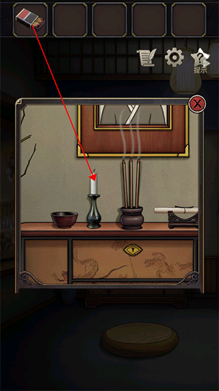 1. 游戏开始时,按照提示点击台子,在台子上能找到火柴,随后用火柴将蜡烛点燃。