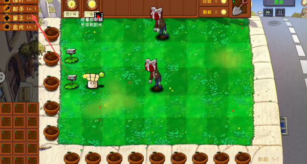 2. 通过阳光让植物产出阳光,于僵尸的进攻路径上栽种攻击型植物(例如豌豆射手)