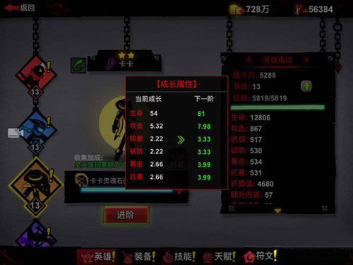 英雄进阶:英雄进阶可以提升英雄的成长属性,即各属性的成长值;
