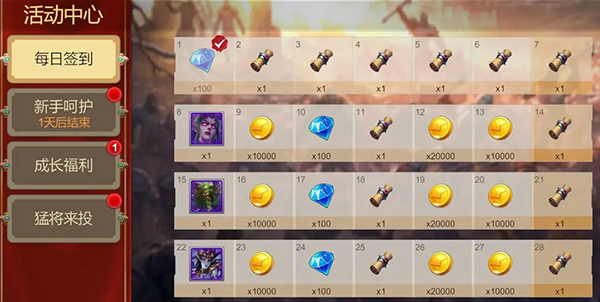 10、通过签到与成长福利,可获得180次抽奖机会,同时还能领取3名稀有英雄。