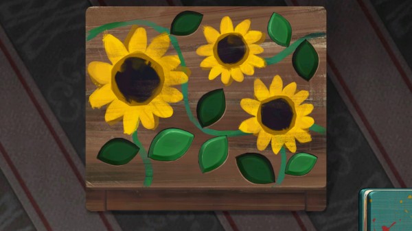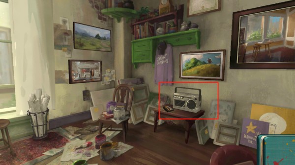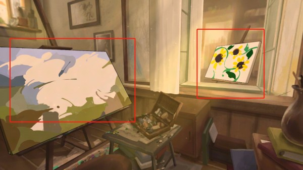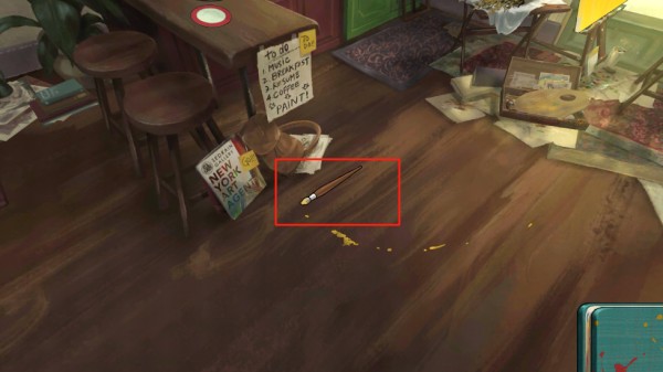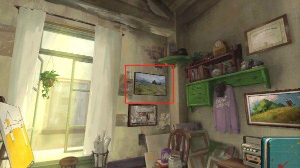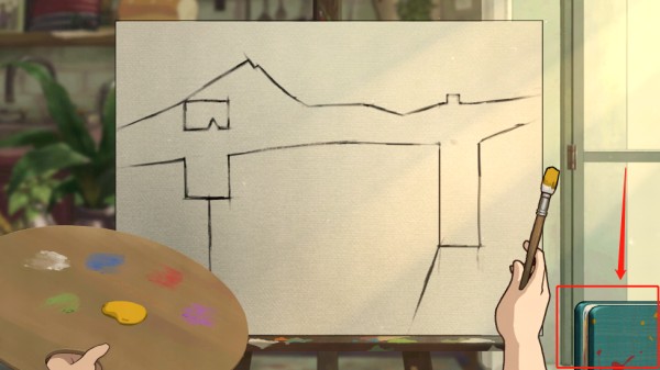 2、于房间的墙面上瞧见画板,取用颜料为伞涂抹上黄色与红色,进而获取信件线索。