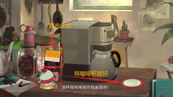 13、首先把咖啡杯摆放妥当,接着通过双击操作将其移动到咖啡机处,随后把咖啡倒入咖啡杯中。