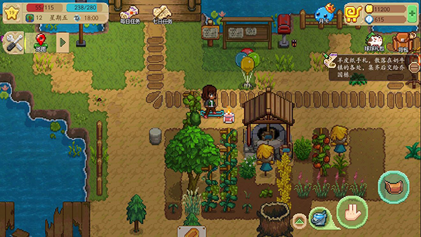 建议将有架子的作物种在距离屏幕最远的那一排,把树种在边上,否则在浇水锄地时,你会发现根本看不到植物在哪里(提醒一下,若不浇水,植物将停止生长)。物品耐久耗尽后,用某种石头修复,点击背包里对应的物品即可。水壶没水时,选中水壶,到池塘边点击池塘里的水就能装水。换季时,普通植物(应季树木除外)都会死亡,你可以使用魔法植物完成未做完的订单(在金币旁边的“+”号里寻找,用钻石购买)。