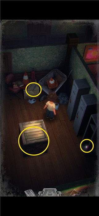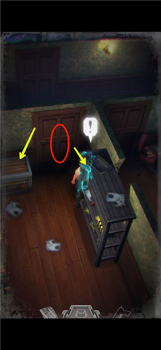 4、箱子属于储物箱,能够用来存放物品(由于男主背包容量受限,暂时不用的东西可放进储物箱)。杂物间的门开启需要钥匙,已用红圈标注。行至图中所示位置,顺着箭头方向面向铁制置物架,松开后,长按屏幕任意地方,就能朝着男主面向的方向推动物品,将架子推开后,从墙壁的空缺处进入另一个房间。