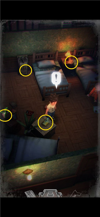 2、当物品可交互时,会有点光闪烁。走到这类可交互物品跟前,会显示惊叹号。一旦出现图中圈出的标识,点击屏幕任意位置,就能触发交互。