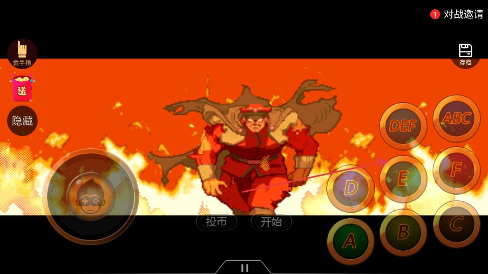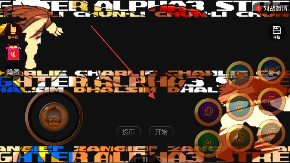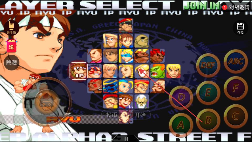 1. 来到游戏初始界面,轻点投币与开始按钮,随即进入角色选择前的过渡画面,为开启格斗对战做好准备。