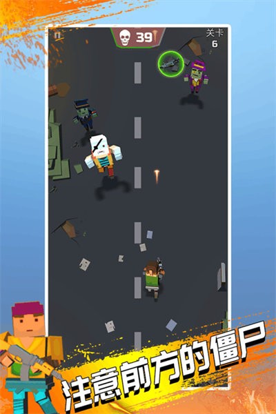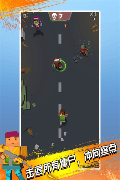 游戏采用极具复古风格的竖版俯视画面,玩家于游戏里操控角色移动,收集道路上形形色色的武器装备,持续射击以消灭扑面而来的僵尸。