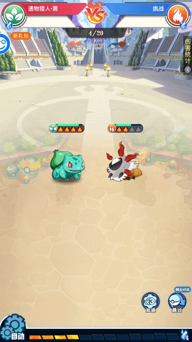 4、选好了精灵后就可以开始作战了,游戏可以放置挂机,会自动攻击,当敌人太过强大时也可以选择先强化再出战。