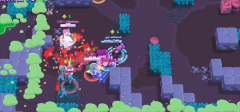 这款游戏采用竖版模式来呈现战斗场景,与《皇室战争》相似,玩家以俯瞰的上帝视角参与游戏。区别于多数MOBA游戏,它没有复杂的技能组合,也不存在进攻防御等提示,极大地简化了繁琐操作。竖版界面的左边设有虚拟摇杆,玩家借此操控角色移动走位,通过点击屏幕来完成射击动作。当弹药命中敌方时,竖版右侧的能量槽便会开始积累能量,待能量蓄满,骷髅头图标会亮起,此时玩家就能释放大招。