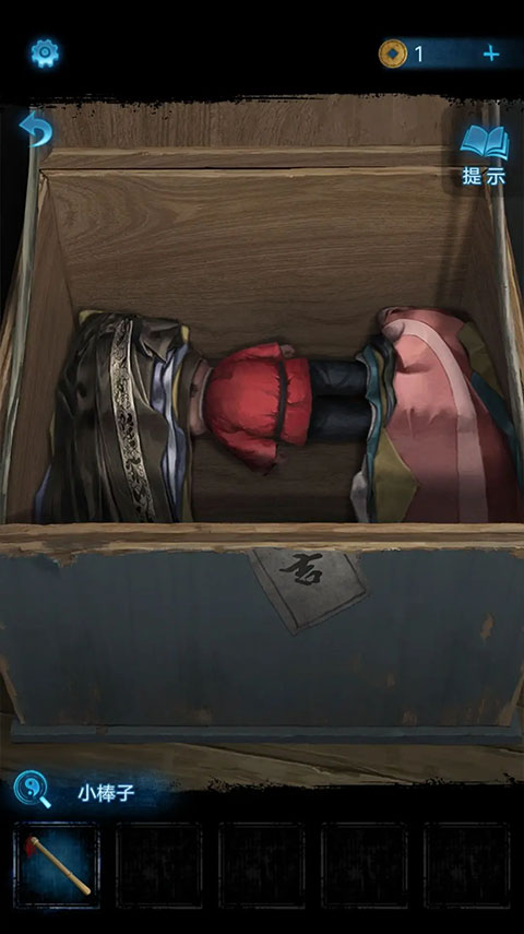 轻轻揭开场地中间的红布,凑近后,拿起小木棒依照顺序进行击打,完成击打动作后,箱子便会自动打开。
