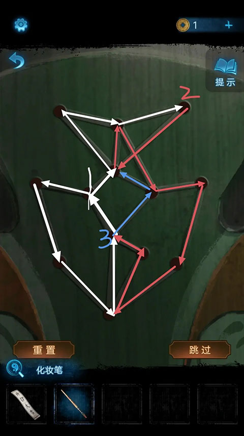 点击左侧绘有脸谱图案的门,使用化妆笔一笔完成绘画(需注意,因部分点需多次经过,故而区分了颜色,顺序为白色→红色→蓝色)。绘画完成后,门会打开,随后进入。