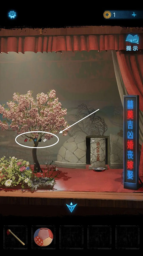 退回到戏台处,这时注意到右边的灯亮了起来,点击这盏灯并仔细观察灯上红字的排列顺序,显示为【囍奠丧婚吉嫁】