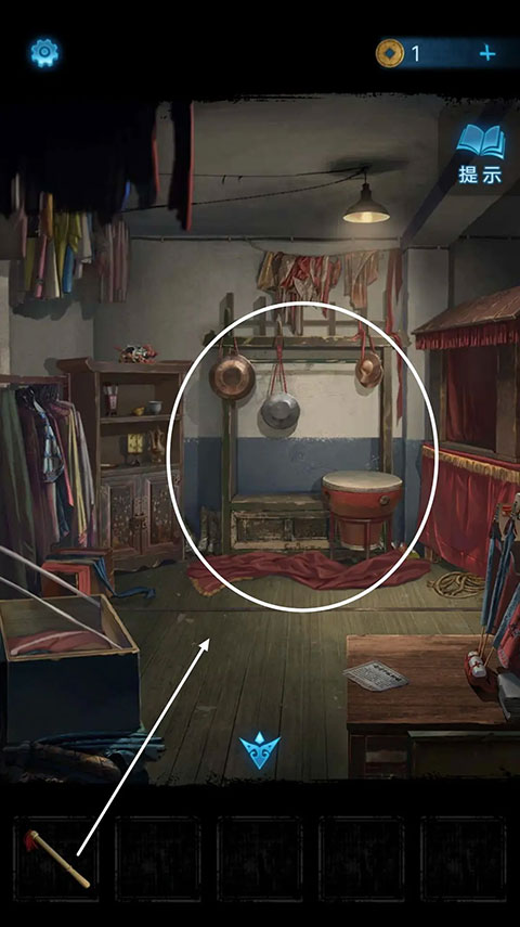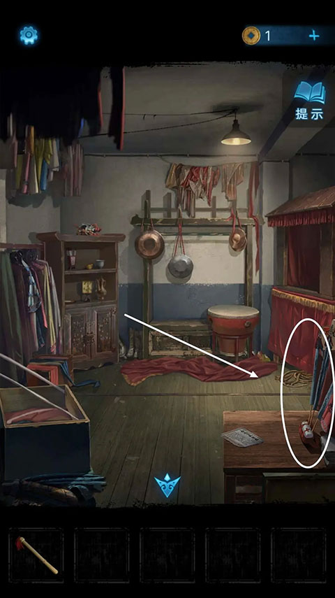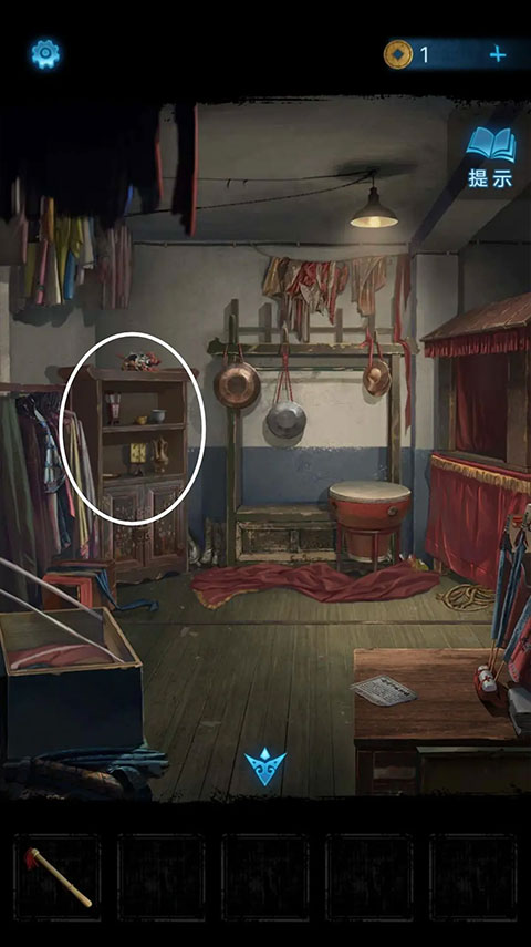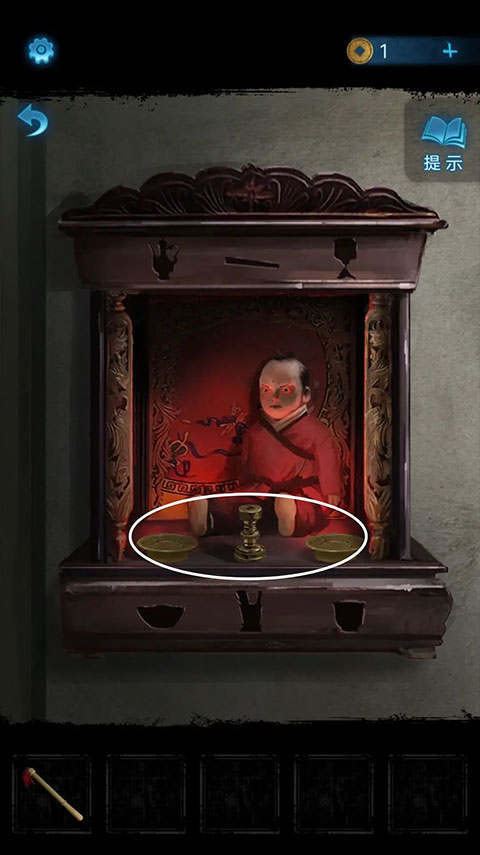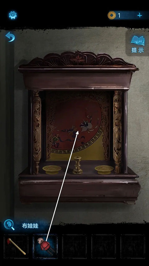 再度回到后台,点击左侧的柜子,依照神龛上浮现出的图案顺序,对柜子上的物品交换位置,随后就能获得布球。