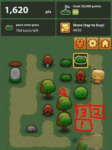 2. 咱们来看上图,接着聊聊布局相关问题。要是后续连续出现4个小草,该怎么摆放呢?我的建议是,别让草挨着草摆,要有长远规划。先在1处放置,接着在2处放,再在3处放置从而合成草丛,然后在4处放置合成第二个草丛。如此一来,三个草丛就能合成一棵树,这棵树又能与下方的两棵树继续合成为房子,并且这个位置离现有的房子很近,后续还有机会进一步跟进合成。