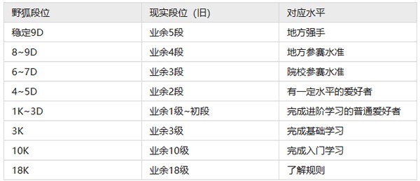3、按照以往标准,野狐段位若在4段以上,其除以2即为现实段位。例如,野狐9段对应现实中平均水平的业5;野狐8段对应标准的业4;野狐7段对应较强的业3……依此类推,野狐4段对应标准的业2 。