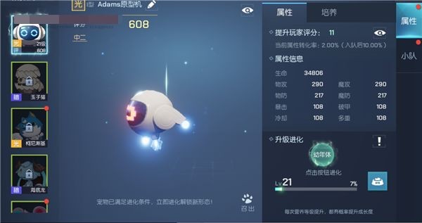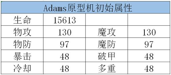 Adams原型机的必杀技为造成一次物理伤害。像双生、执行者这类魔法型职业,自身所造成的伤害属于魔法伤害。若宠物能够提供物理伤害,就能使自身伤害属性更加全面,让对手无法仅依靠单一的魔法防御属性来抵御自己的所有伤害。具体属性信息见下图,其属性虽不算强大,但对主角还是有所助力。