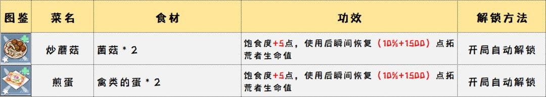 1. 海鲜汤:食材包含角海螺、惑哒贝以及生菜,食用后可增加冰冻攻击1% + 35 。