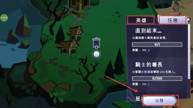 3、在地图界面,能够查看【英雄】与【任务】的详细信息,准备妥当后点击【出发】,开启挑战。