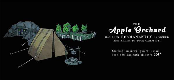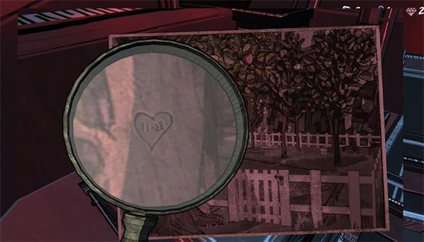 2、再次进入可以在角落找到苹果园的照片,有放大镜就可以看到树干上爱心里有日期1128。