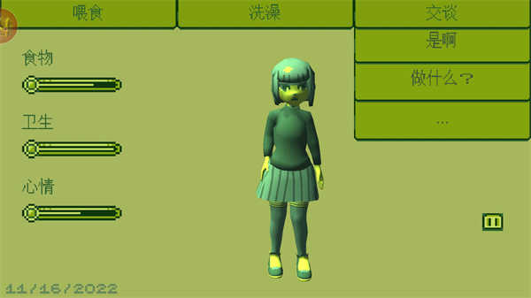 2、此地存在食物、卫生、心情这三个方面的元素,每次做出选择,都会对女孩产生影响。与女孩展开互动,还会发生一些饶有趣味的故事。