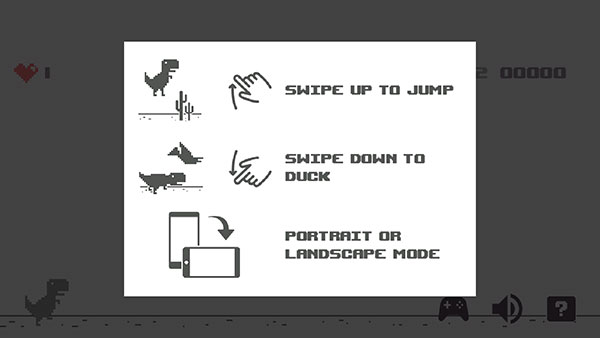 只需按一下空格键(或者向上键),小恐龙就跑起来了。沿途遇到障碍(比如仙人掌 )的时候,按一下向上键,帮助小恐龙跨越障碍。持续按住向上键的时间越长,小恐龙就跳得越高。
