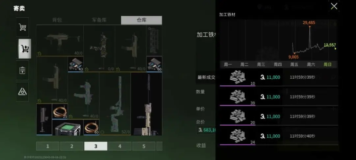 3、寄卖价格在周一处于最低水平,周四至周日价格达到最高。要是对铁零件有大量需求,且在寄卖市场难以买到,不妨考虑以合理价格购买箱子来开启获取,箱子类型不局限于旧铁箱。
