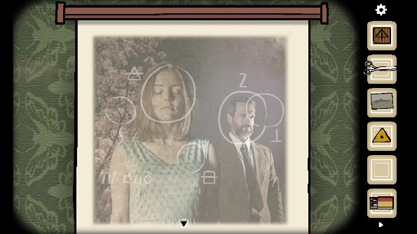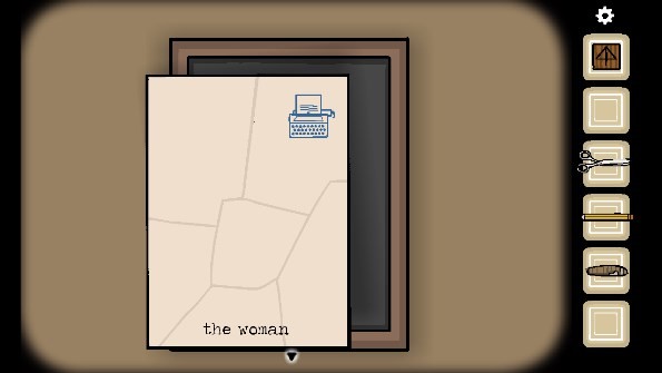 5、把五个碎片都放置在相框上,就能得到提示「the woman」(中间有一个空格)。接着点击打字机,输入英文后会出现一张纸,用铅笔在纸上出现的男人、门、女人等图案处进行涂抹,最后涂抹钥匙图案,即可获得「钥匙」。
