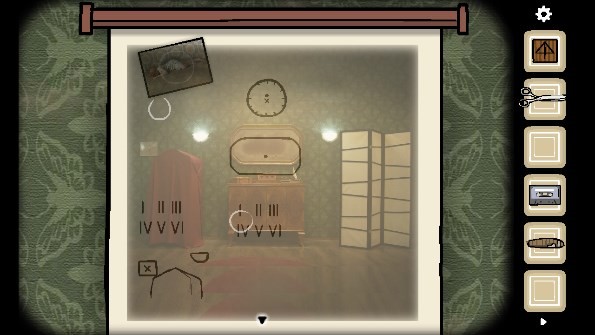 1. 从衣架上取走「大衣」,接着打开旁边的三层抽屉,拿出里面的「剪刀」、「照片碎片」以及「铅笔」。随后,打开门旁的开关,走到右边,取走灯罩里的「照片碎片」。