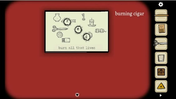 27、在打字机上敲入“burn”,随后会出现一张传单。接着,拿剪刀从传单中间剪开,把剪开的两张纸重叠放置。按照纸上“燃尽一切可燃之物”的提示,用雪茄把纸上能够被点燃的部分烧出洞,这时就会得到提示“life” 。