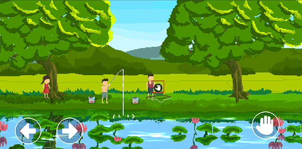 2、选择帮大宇钓鱼,接着继续向右移动至鱼竿位置,当鱼竿上方出现对话图标时,点击右下角的手印,随即开始钓鱼。