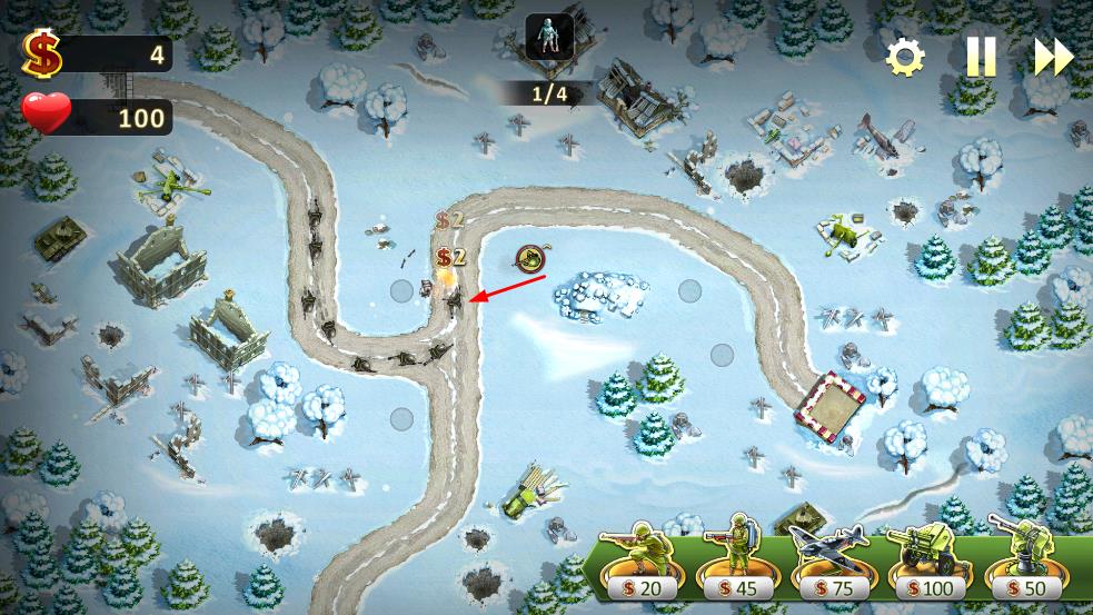 1. 踏入关卡,于道路的空闲位置部署士兵等防御塔,构建初始的防御阵线。