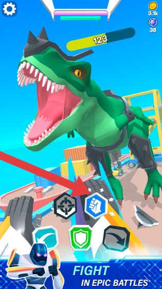 3、画面里呈现出低多边形风格的恐龙形象,其下方设有技能操作按钮。