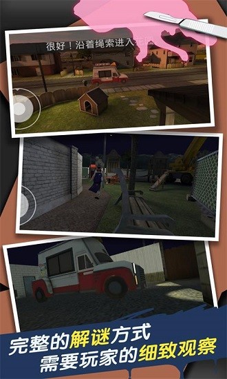 游戏启动后,先点击橱柜上的酒瓶,它会掉落摔碎。等房间里的人离开后,走到玻璃碎片的位置,那里的绳子会断开。接着点击上方的天窗,再点击橱柜,借助橱柜爬上后两次点击天窗,跌落后立刻跑到楼下的隐蔽处躲藏(因为有人即将返回)。等对方再次离开,你就能安全出去了。