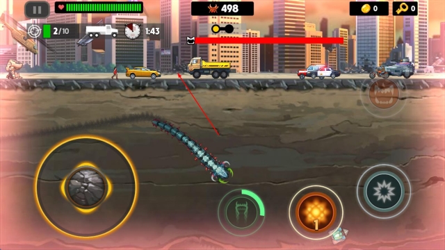 2、在关卡进行过程中,操控蠕虫攻击动物、人类以及车辆、飞机,以此获取炸弹等奖励来强化自身能力,通过使用加速飞天技能和其他破坏技能,积累经验值完成升级。