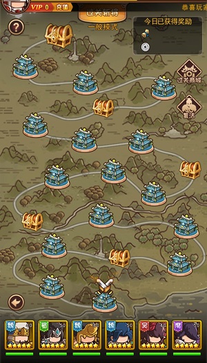 过关斩将采用三关斩敌将,一关领宝箱的模式玩法,共15关。通关前一关后会自动开启下一个挑战