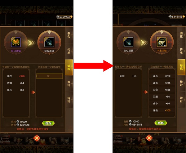 关于装备系统,有几个关键要点需要注意:首先是强化等级的处理——强化过的装备不必直接分解,其等级可以转移到新装备上,直接分解会损失大部分价值。其次是附加属性的优化技巧:若想将某件装备的优质属性转移到主力装备上,建议先准备一件基础装备,尝试让它随机生成目标优质属性,再通过熔炼操作将这件基础装备与主力装备融合,这样能确保优质属性被稳定继承。 在装备选择方面,前中期性价比最高的是四阶玄铁系列装备。这套装备集齐2件、4件、7件时,会分别解锁三个被动增益称号,提供可观的属性加成,即使是中低投入玩家也能长期使用。玄铁装备的核心获取途径是用经书兑换,因此经书资源务必谨慎使用,前期避免随意消耗,以免后期无法兑换玄铁装备而影响进度。