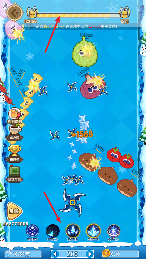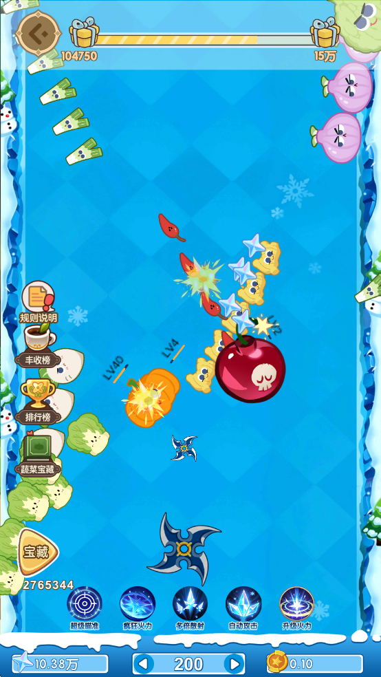 2、选择下方的散射等功能,能够为你提供更高的火力,消灭蔬菜将会获得积分。