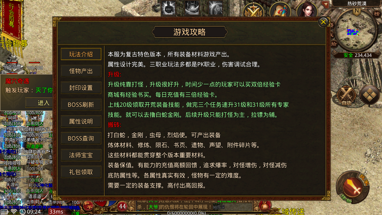 本服为复古特色版本,所有装备材料游戏产出,属性设计完美,三职业玩法多都是PK职业,伤害调试合理,人人都能享受激情!