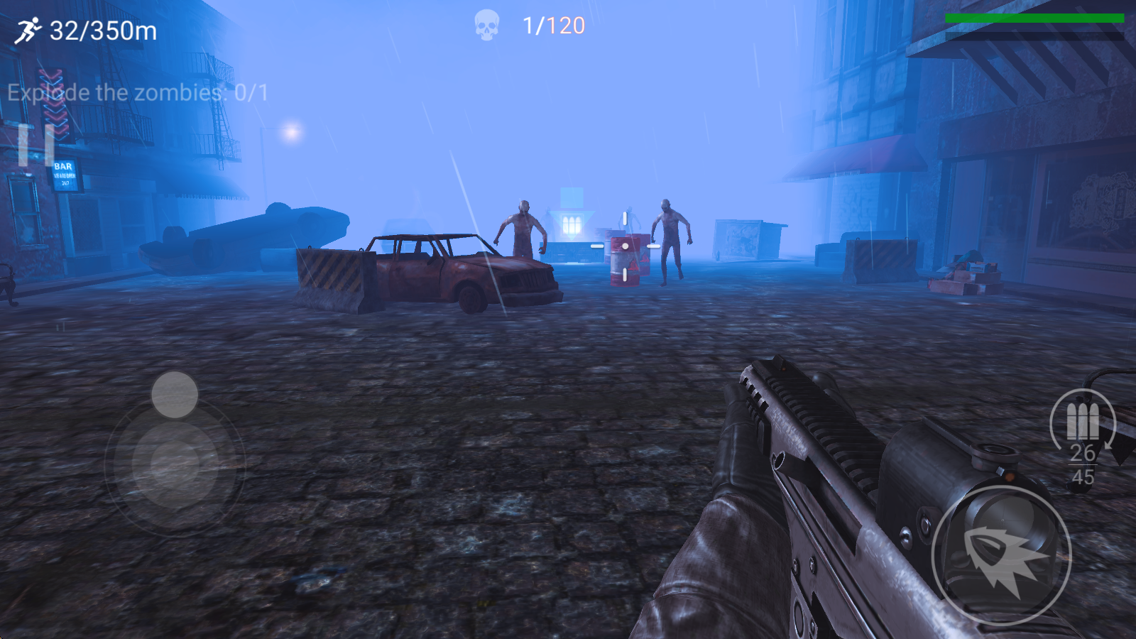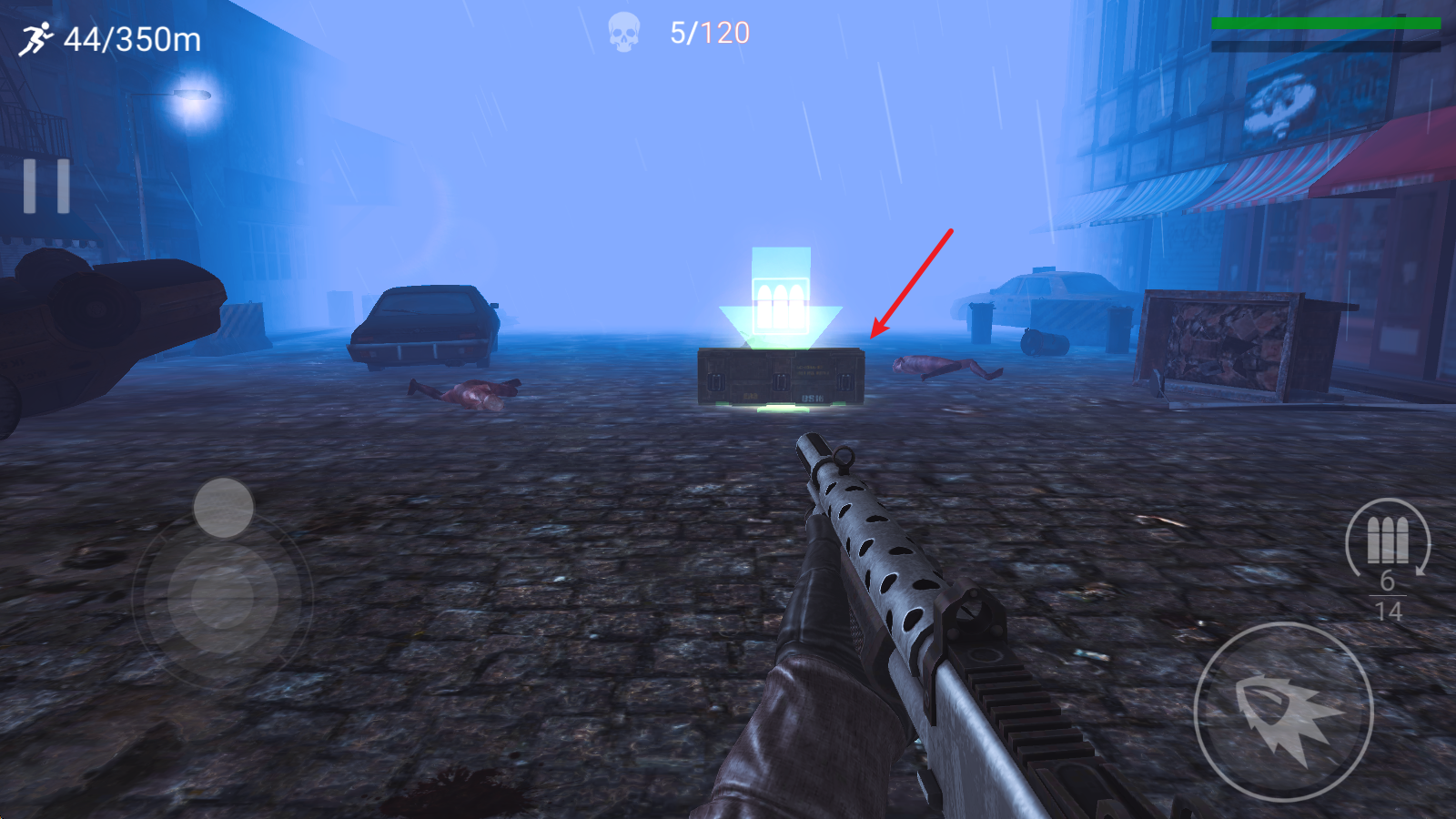 2在游戏里,拖动左侧屏幕就能控制移动,枪支会自动锁定敌人,点击右侧的子弹按钮就能开枪射击。
