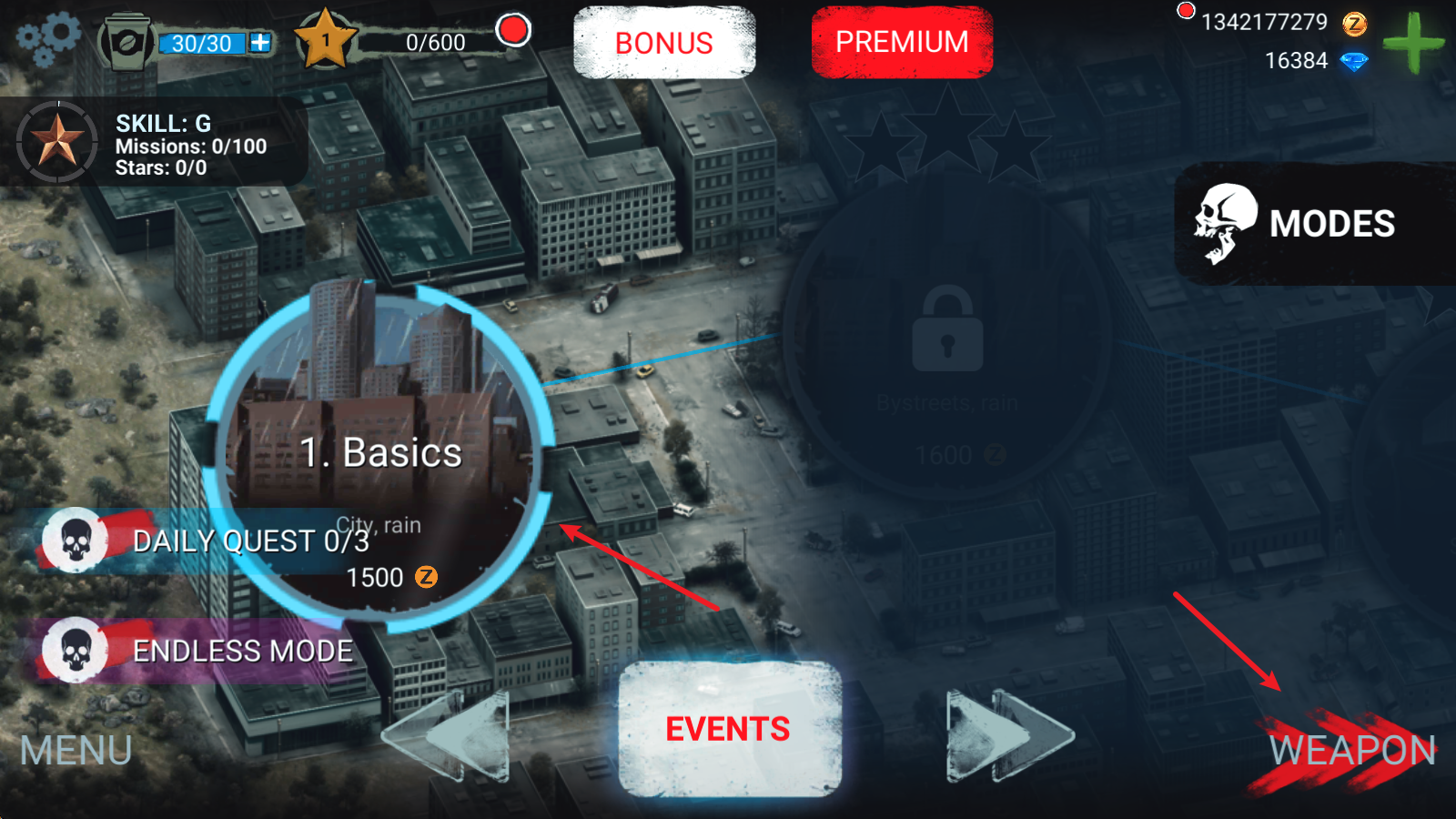 1、点击“开始游戏”后,我们可以选择关卡开启挑战,点击右下角的WEAPON按钮还能进行武器配置。