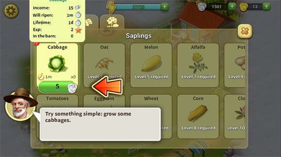 4、使用金币能够解锁农作物,每种农作物都有对应的成长周期与经验值,点击即可查看详细数据。