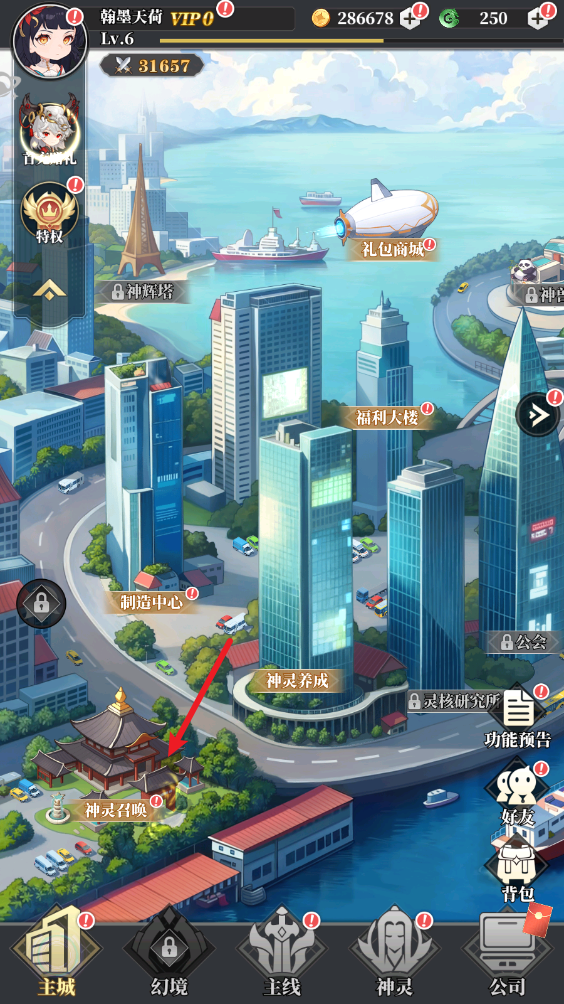 6、回到主界面,在主城的神灵召唤这里可以去召唤更多的角色。