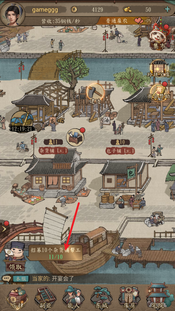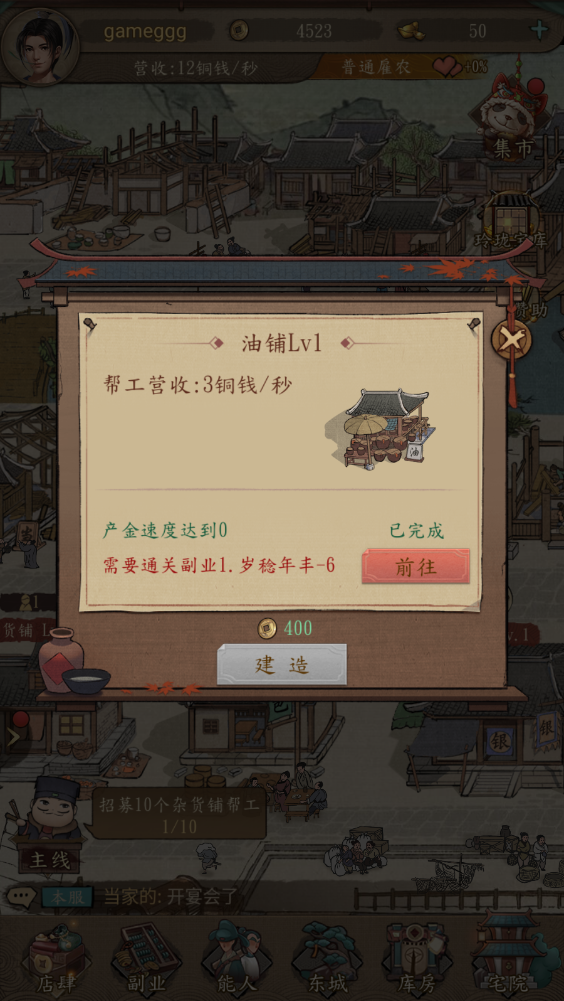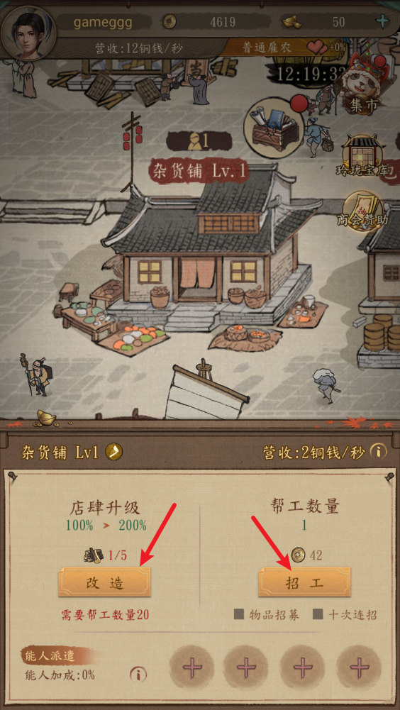 4、点击商铺可以进行招工,或者是升级店铺,以此来提高店铺收益。