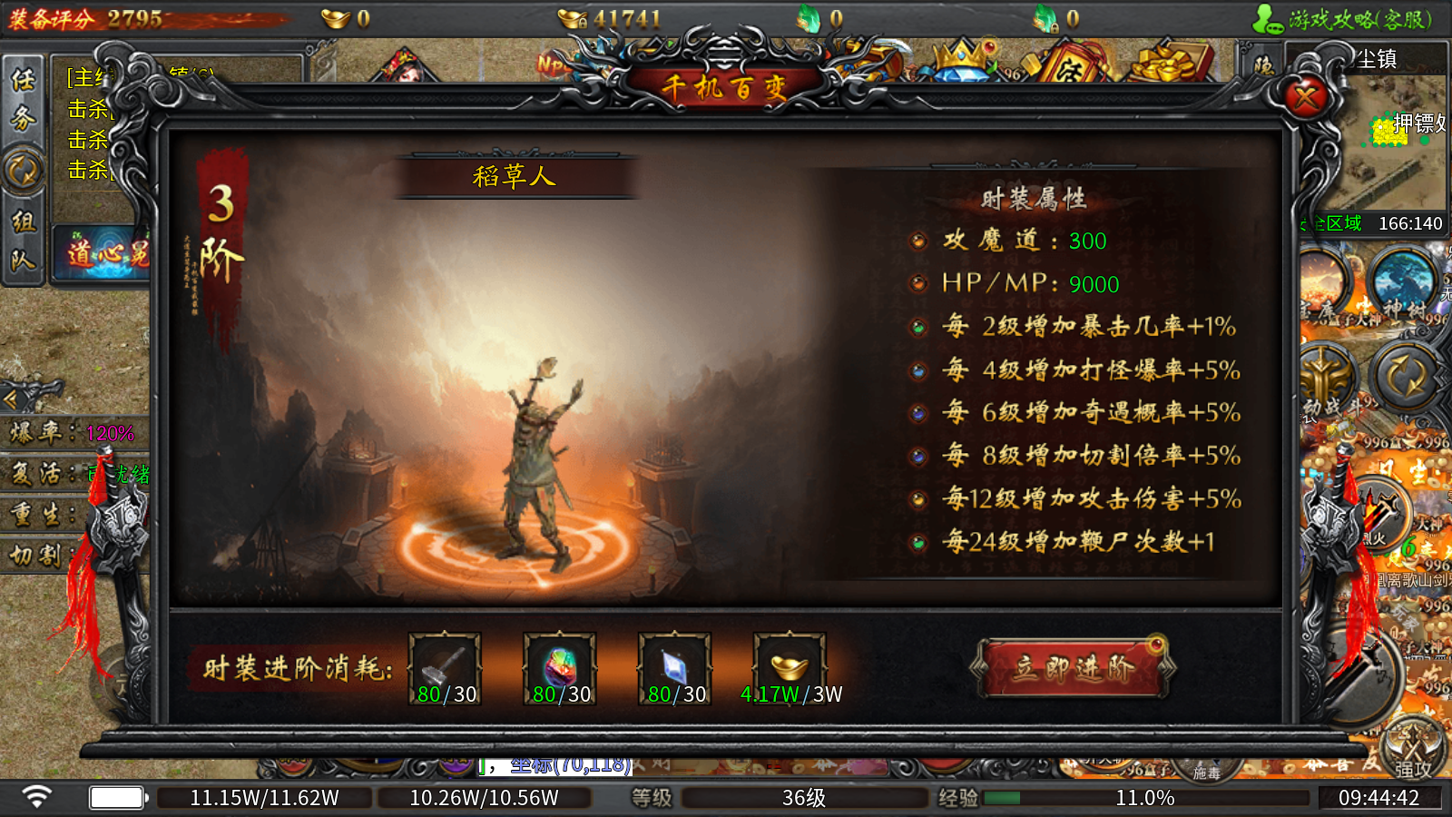 1有一种名为“千机百变”的玩法,玩家可以通过消耗特定的道具(如天工锤、元素石、装备结晶)和元宝来提升其等级。每提升一个等级,玩家都能获得可观的攻击力、魔法力、道术属性以及生命值加成。此外,随着等级的不断提升,还能解锁并获得各种强大的增益效果(BUFF),这些效果会根据等级的不同而有所变化,为玩家提供更全面的战斗支持。