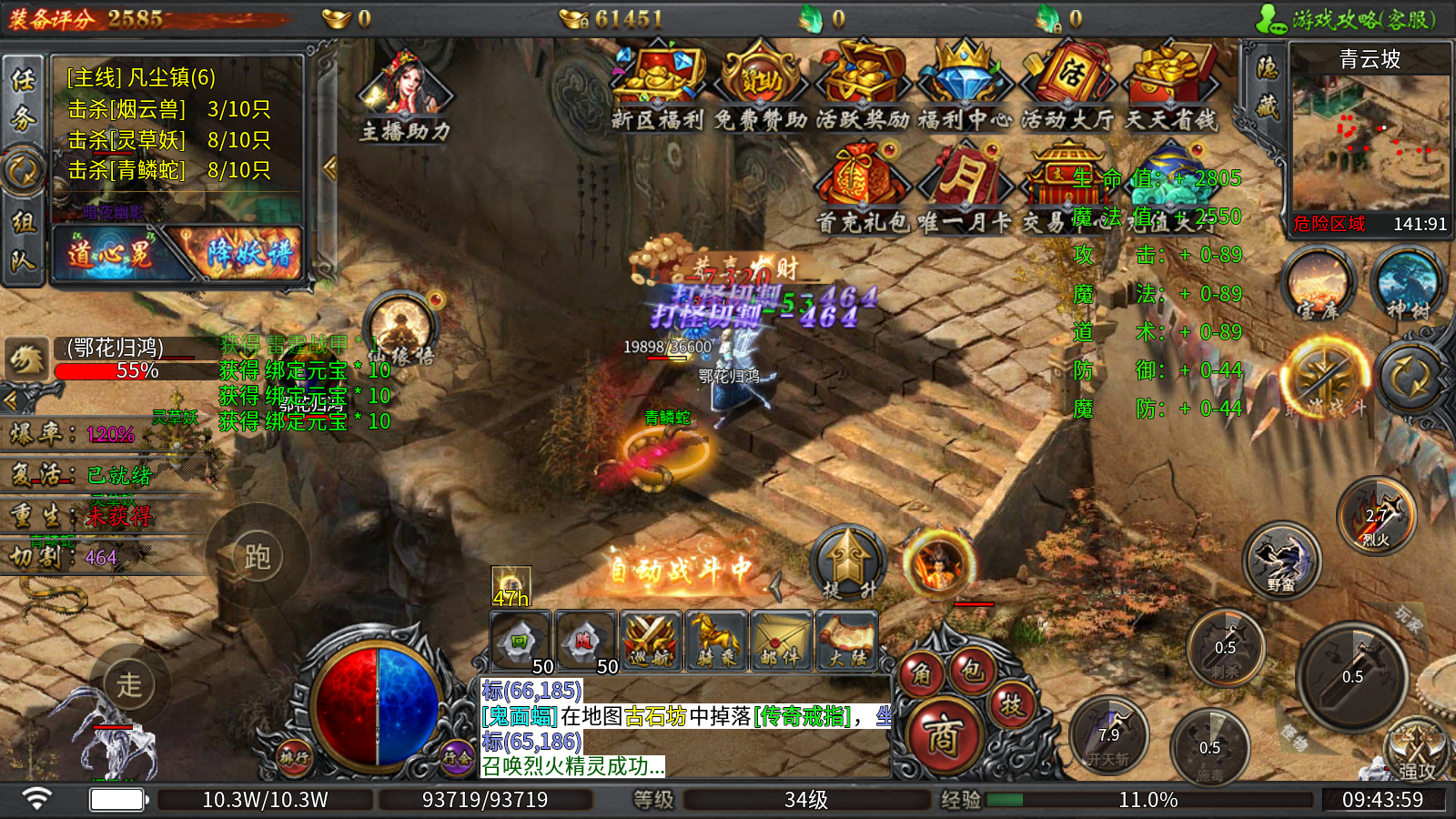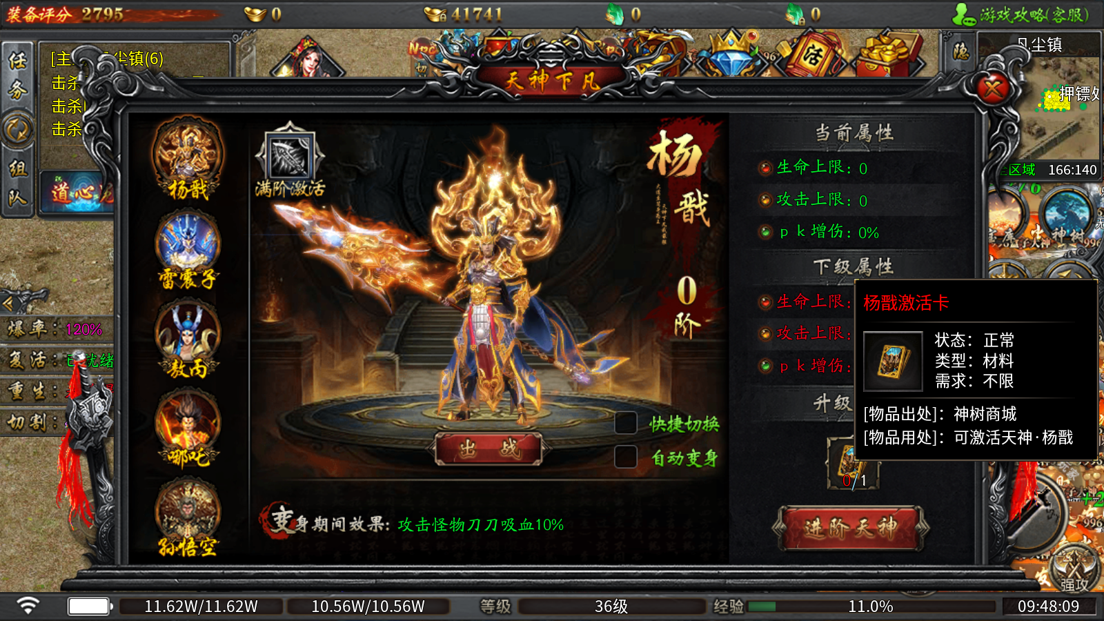2、天神下凡:消耗对应角色的激活卡即可开启,开启后可提供生命、攻击与PK增伤等属性加成,并且在变身状态下还能获得各类额外增益效果。