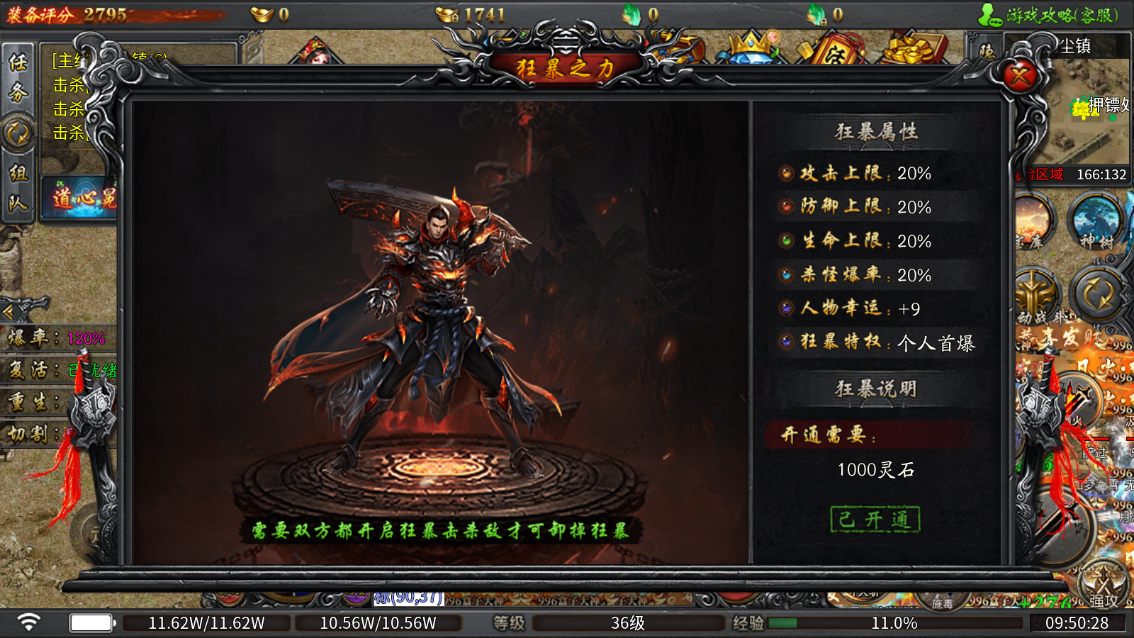 4、狂暴之力:消耗灵石就能开启,可提供攻击、杀怪爆率、人物幸运等属性,而且只有在双方都开启狂暴状态时,击杀敌方才能卸掉对方的狂暴效果。
