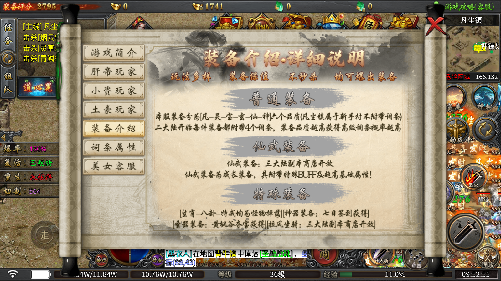 1、普通装备:本服装备品质划分为[凡-灵-宝-玄-仙-神]六个等级(凡尘镇作为新手村,产出的装备不带有词条),从二大陆起,每件装备都会附带4个词条,装备的品质越好,获取高级词条的几率就越大。