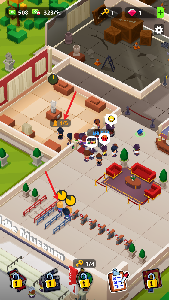 1、进入游戏后,可以看到最基本的经营过程,客人通过门口买票,然后进入场馆参观,以此来赚钱,参观过程中则需要导游带领,每次带领的人数有限。