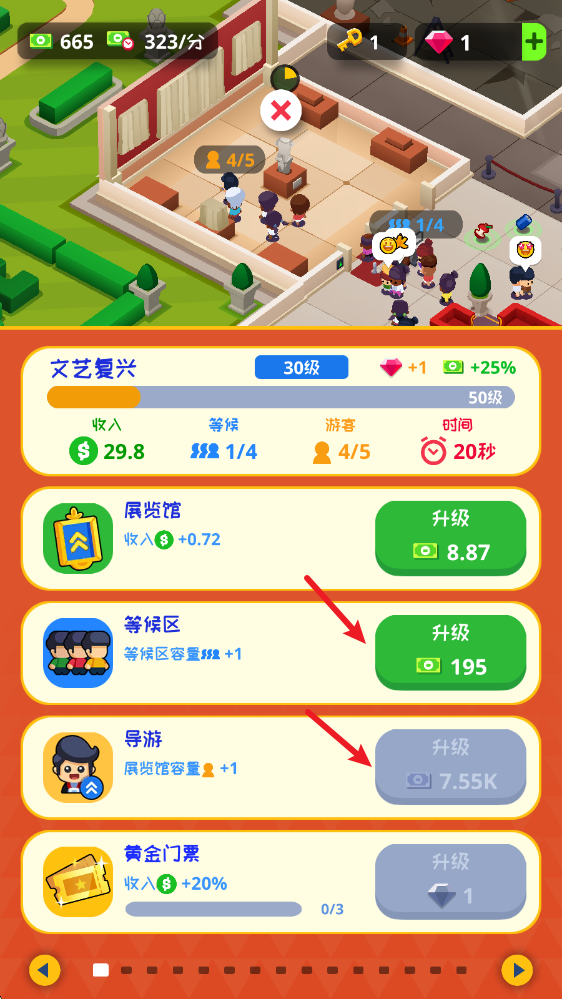 2、我们可以通过升级的方式来提高票价,以及提升导游所带的人数。