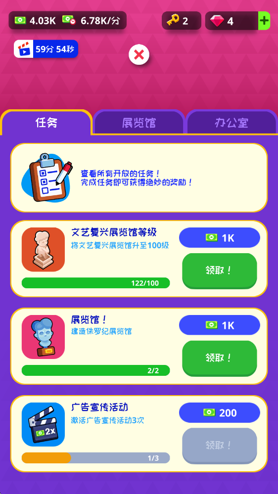 挂机博物馆大亨,英文全名为Idle Museum Tycoon:Art Empire,是一款卡通风格的模拟经营。在游戏中,我们将会成为博物馆的馆长,立志将它发展成为全球最知名的博物馆。为此,我们需要四处探险来寻找各种古董化石,或者去解锁各种珍稀宝物来提高博物馆的吸引力,通过售卖门票来赚取更多的利润,一步步的扩展博物馆的规模!我们将在游戏中简单各种风格的展览馆,如中美洲、侏罗纪、文艺复兴、当代艺术等等,过程也是相当的有意思!